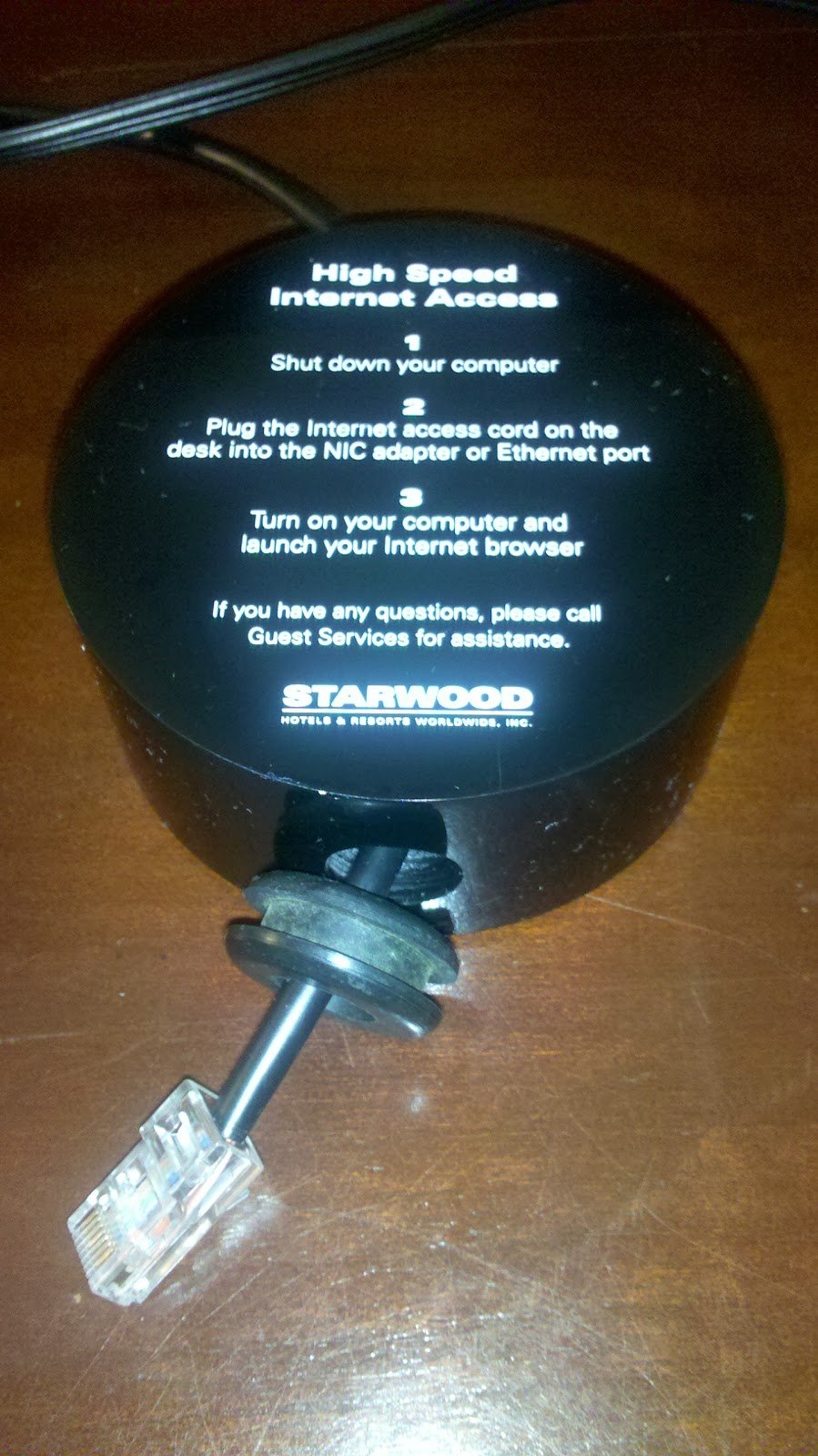 Here is a good example of a simple poka yoke and standard work posted at point of use. So first of all the black disc is heavy like paper weight so it keeps the cord on the desk where you want it. They slide a simple rubber grommet over the connector to prevent the cord from sliding through the hole in the black disc. The disc has the instructions printed on it so that you can easily connect to the internet.