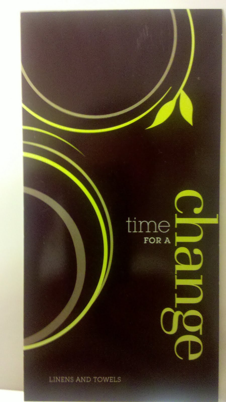 Here is an example of a kanban signal. Hotels try to conserve energy and water by reducing the number of laundry runs. They do this by giving the hotel guest the option to use their towels and linens multiple times if they stay multiple nights. So in this case you place this card on the bed if you want to tell the hotel maid to change the linens or towels. It signals replenishment from their inventory of clean linens. On the back of the card (not pictured) are the instructions explaining this process.