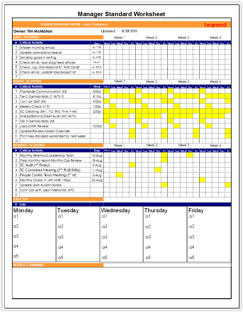In simplest terms, Leadership Standard Work is a check-list of leadership activities to be performed on a daily, weekly and monthly basis. What makes this tool exceptionally effective is that, when well defined, Leadership Standard Work drives process definition and daily accountability.