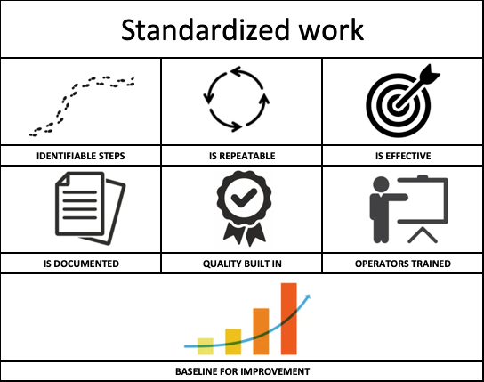 Standard work is a written description of how a process should be done. It guides consistent execution. At its best, it documents a current “best practice” and ensures that it is implemented throughout a company. At a minimum, it provides a baseline from which a better approach can be developed.