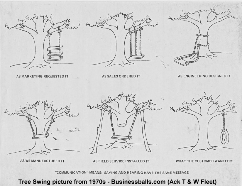 The diagram illustrates the pitfalls of poor product design, or poor customer service, and the dangers of failing to properly listen to customers and interpret their needs. The tree swing also demonstrates the dangers of departmental barriers, and failures of departments to talk to each other, and to talk to customers. As such, the tree swing is perfect for training these areas of quality, communications, customer care and inter-departmental relations.