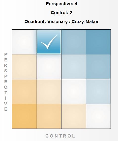 Your “perspective” score was 4 and your “control” score was 2. This means you have scored in the “Visionary / Crazy-Maker” quadrant.