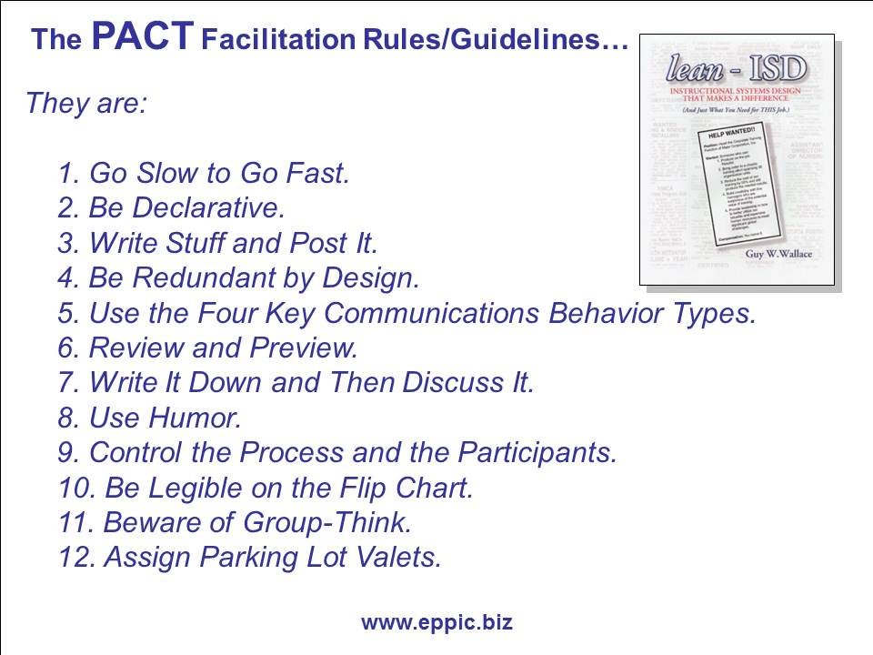 Years ago – back in the early 1990s I believe – I constructed the following 12 Rules/Guidelines for Facilitation/Facilitators that I was training and certifying in my Instructional Systems Design (ISD) methodologies – where being able to facilitate teams in a number of different ISD Processes was a key enabler. A showstopper enabler if you will.