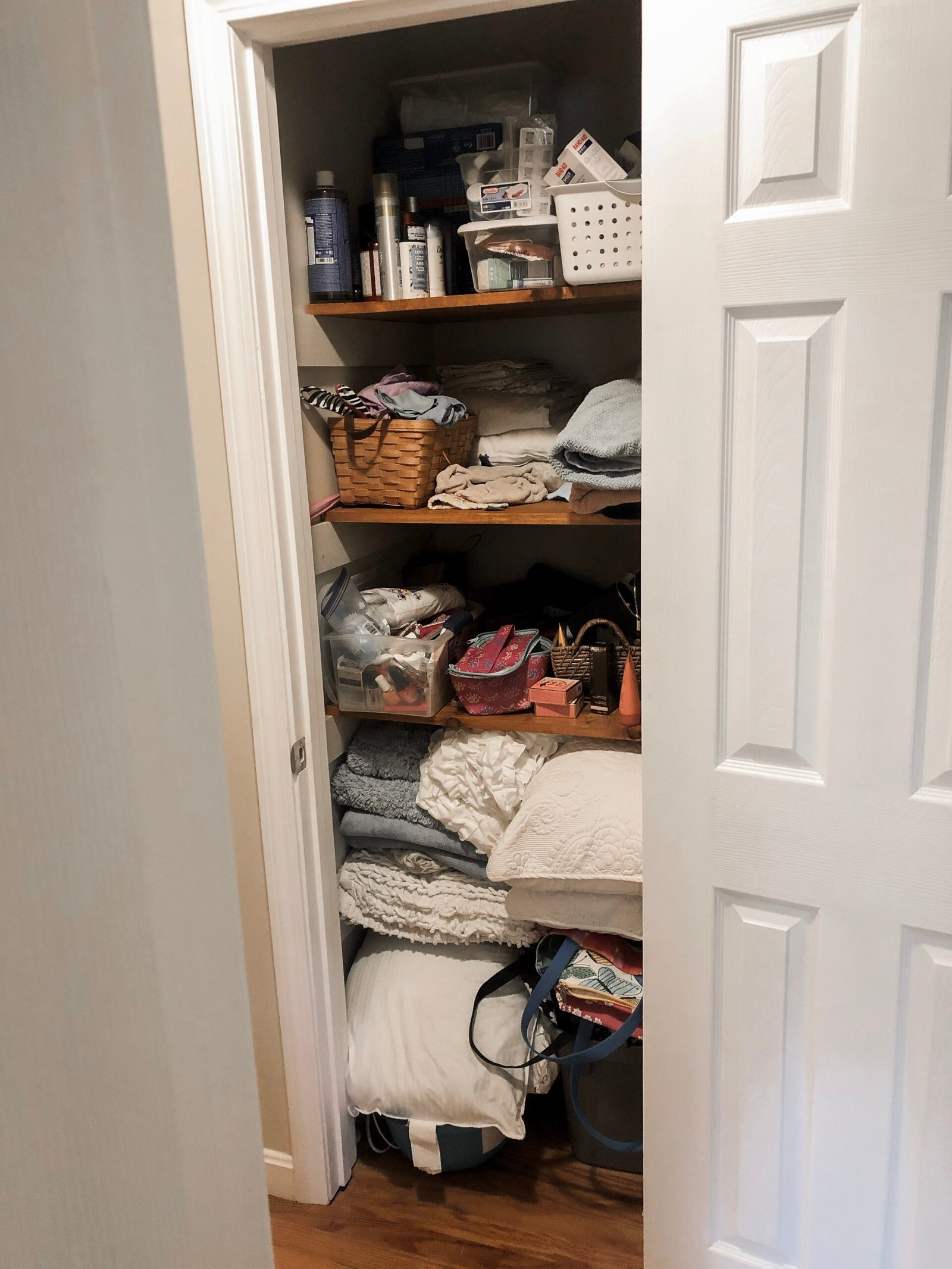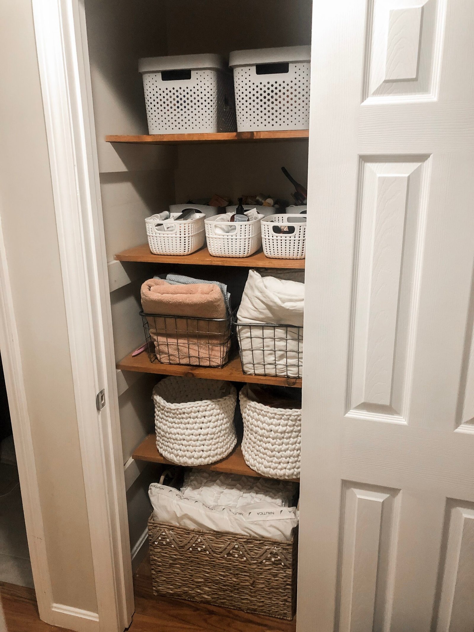 This morning, both of my kids were excited to see the results of my project. Their towels, plus the things Matthew requested were all neatly organized on the bottom shelf. There is no longer anything stacked on the drying rack, so the kids can easily reach the toilet paper. The next shelf includes towels that are used to wipe up messes, and the kids can also reach that easily. The towels my husband and I use are on the next shelf up, while the chemicals remain out of reach at the top. Next summer, Matthew and Hannah will be able to get their own beach towels out when we go to the pool.