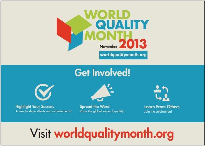 Join the Global Quality Community in celebrating World Quality Month in November 2013! Now in its fourth year, World Quality Month provides a platform for acknowledging the efforts and accomplishments of the Global Quality Community. This is a time to celebrate—a time to showcase the advancements and valuable quality contributions in businesses, communities, and institutions.