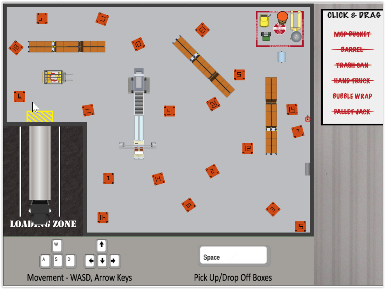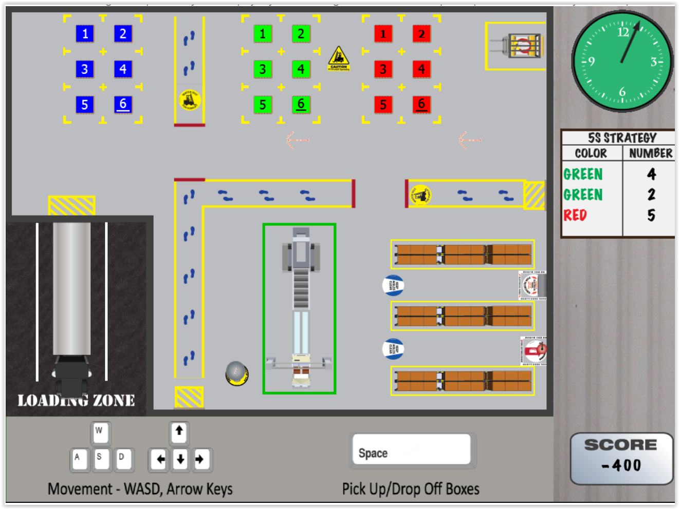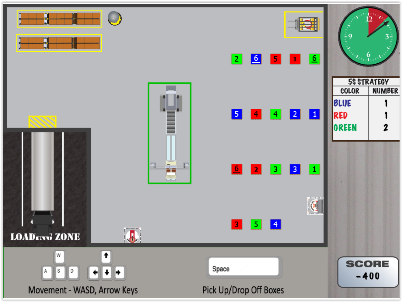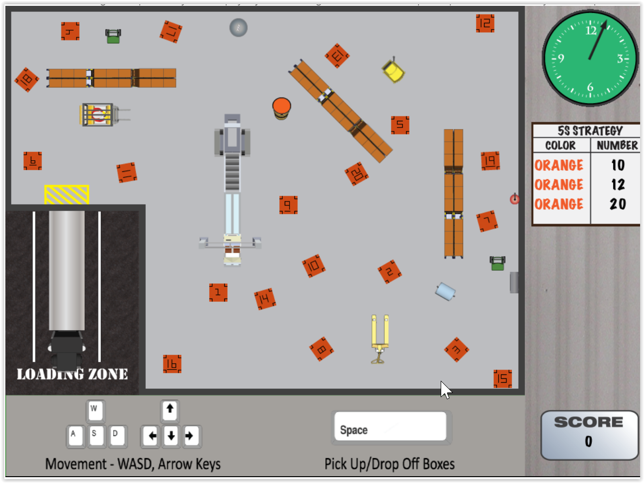 Insite Solutions recently created a game to help people learn Lean and 5S principles. The seen is a factory setting where you need to drive a fork truck to pick up certain loads. As you can see from below it is very difficult with the disorganized work space. You are timed for which you earn points for completed loads and loose points for hitting objects.