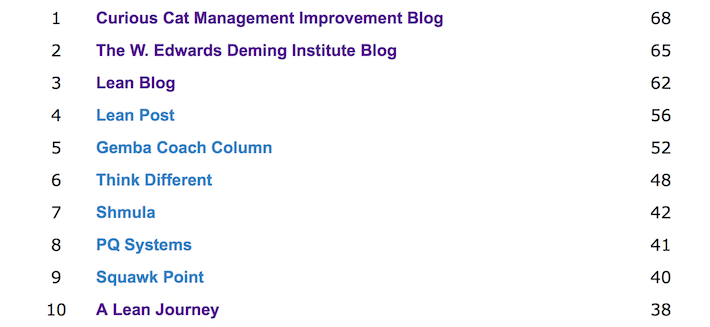 John Hunter with Curious Cat Management Improvement Blog recently ranked the top management improvement blogs. A Lean Journey was ranked 10 out of 43 blogs.