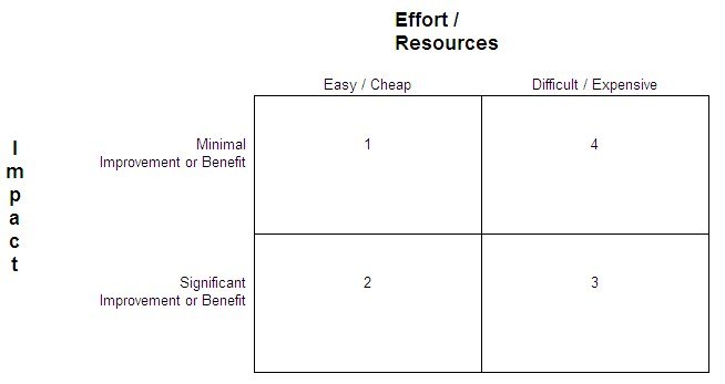 • Ideas placed in quadrant 4 are difficult and expensive and produce minimal benefit. Ideas from this quadrant should generally be discarded.